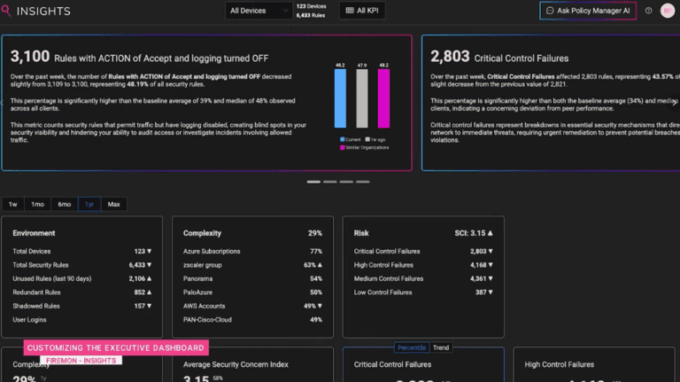 Quantifying the success of network security policy management efforts is hard. Insights shows you at a glance your performance over time and versus peer benchmarks. The executive dashboard delivers AI-generated insights from KPIs as well as focused set of KPI statuses, benchmarks, and trends.